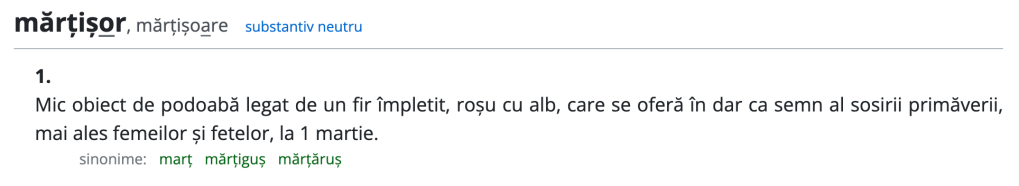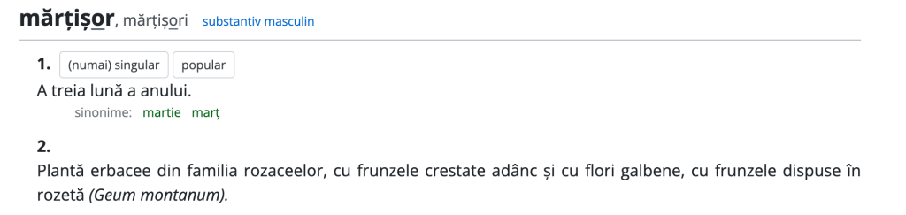 Below the definition of Mǎrțișor from Dex – equivalent of the Cambridge dictionary for Romanian language.